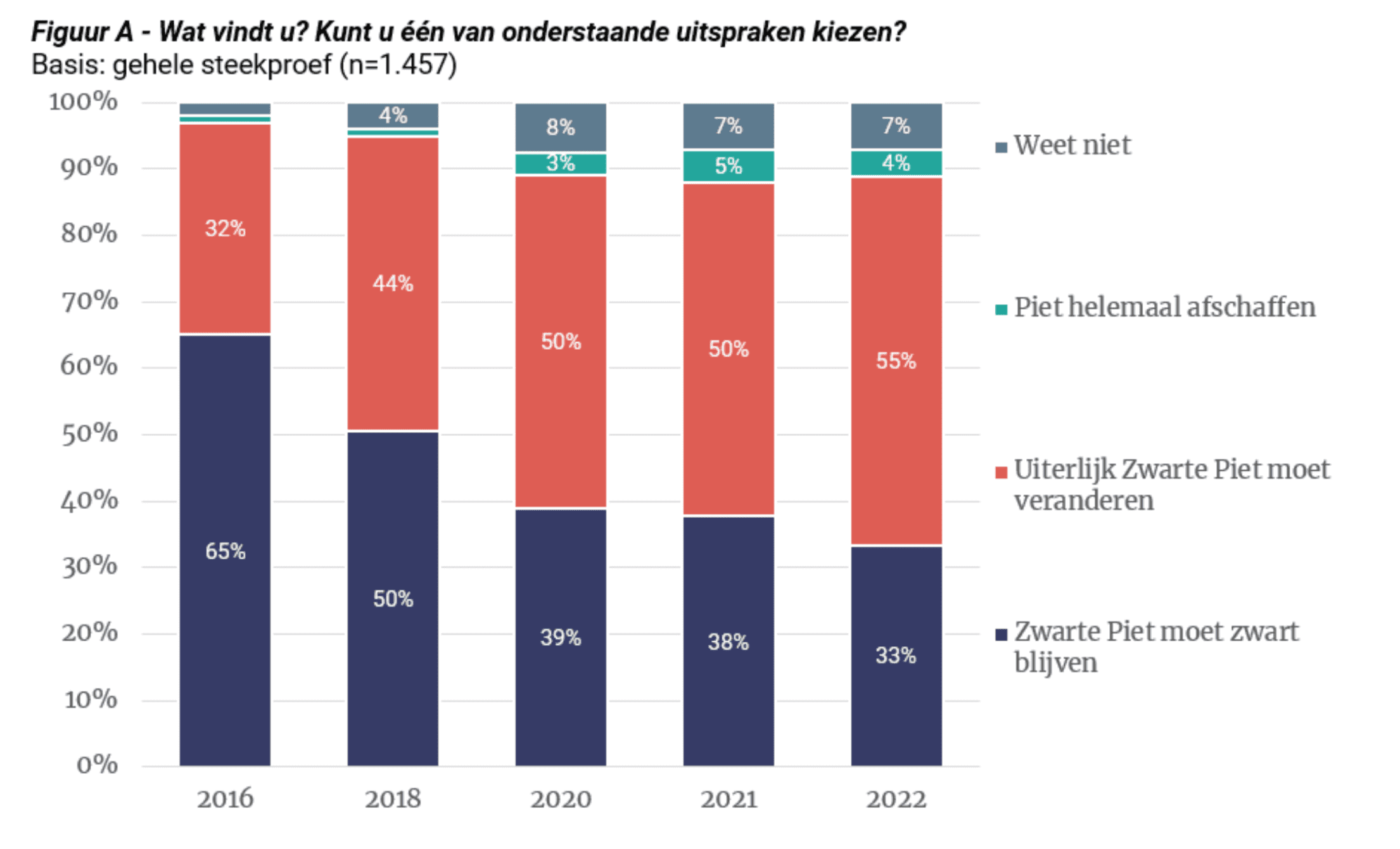 Ditzelfde voorbeeld laat ook zien dat het wel kán om bestaande wereldbeelden te veranderen. Afriyie hield vol en richtte Kick Out Zwarte Piet op, een actiegroep die voortdurend met vreedzame demonstraties aandacht vraagt voor dit (voor veel Nederlanders) nieuwe wereldbeeld. Onderstaande cijfers laten zien dat dit heeft gewerkt. Ook al vonden mensen het vervelend en was (en is) er veel weerstand. Binnen zes jaar kantelde de mening over Zwarte Piet volledig: van een meerderheid tegen verandering (66 %) naar een meerderheid (55 %) vóór.