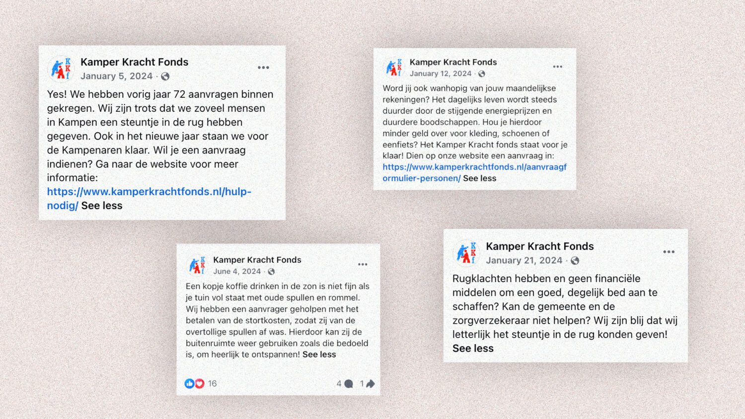 Volgens Kievit en De Wal heeft hulp van het Kamper Krachtfonds een duidelijke voorwaarde. Er mag geen ander noodfonds of potje bestaan waar de aanvrager voor in aanmerking komt, ook niet bij de gemeente. Het zegt iets over de verhouding tussen fonds en overheid. Namelijk dat gemeenschapsfondsen precies daar actief zijn waar de overheid dat niet is of niet méér is.